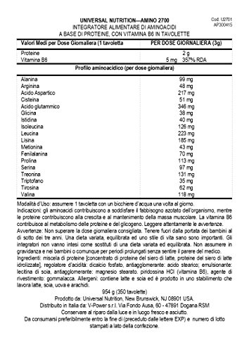 Universal’s Amino 2700 is a high quality, sustained release amino acid formula packed with L-form and peptide bonded amino acids. Amino 2700 contains a full spectrum of essential, non-essential and conditionally essential amino acids. Our amino acids are derived from whey protein concentrate (WPC) and whey protein hydrolysate (WPH) which allows for quicker assimilation into muscle tissue. Each tablet is packed with over 2,000mg of amino acids, and when taken prior to each meal, it becomes ideal for increasing overall amino intake throughout the day.Feature