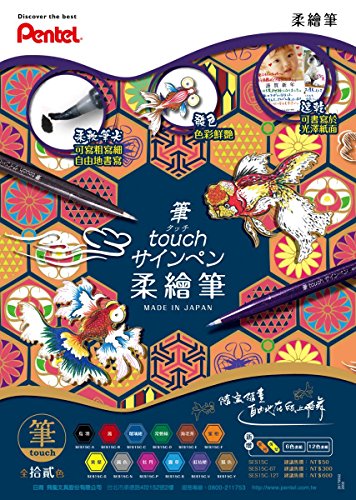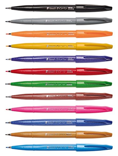 Pentel Touch Sign Pen, Fude Brush Tip, 12 Assorted Colors in pen pouch, Japan model (SES15C-12ST) (12 colors set)