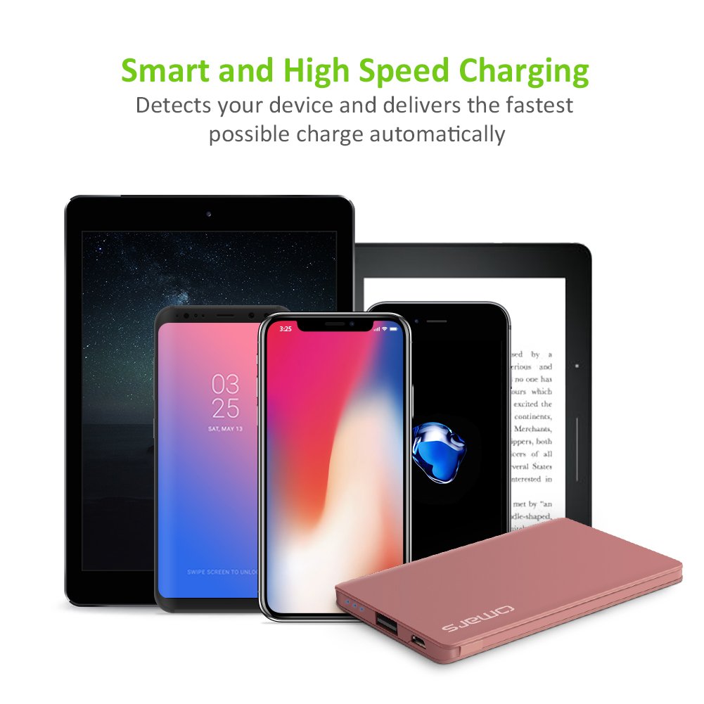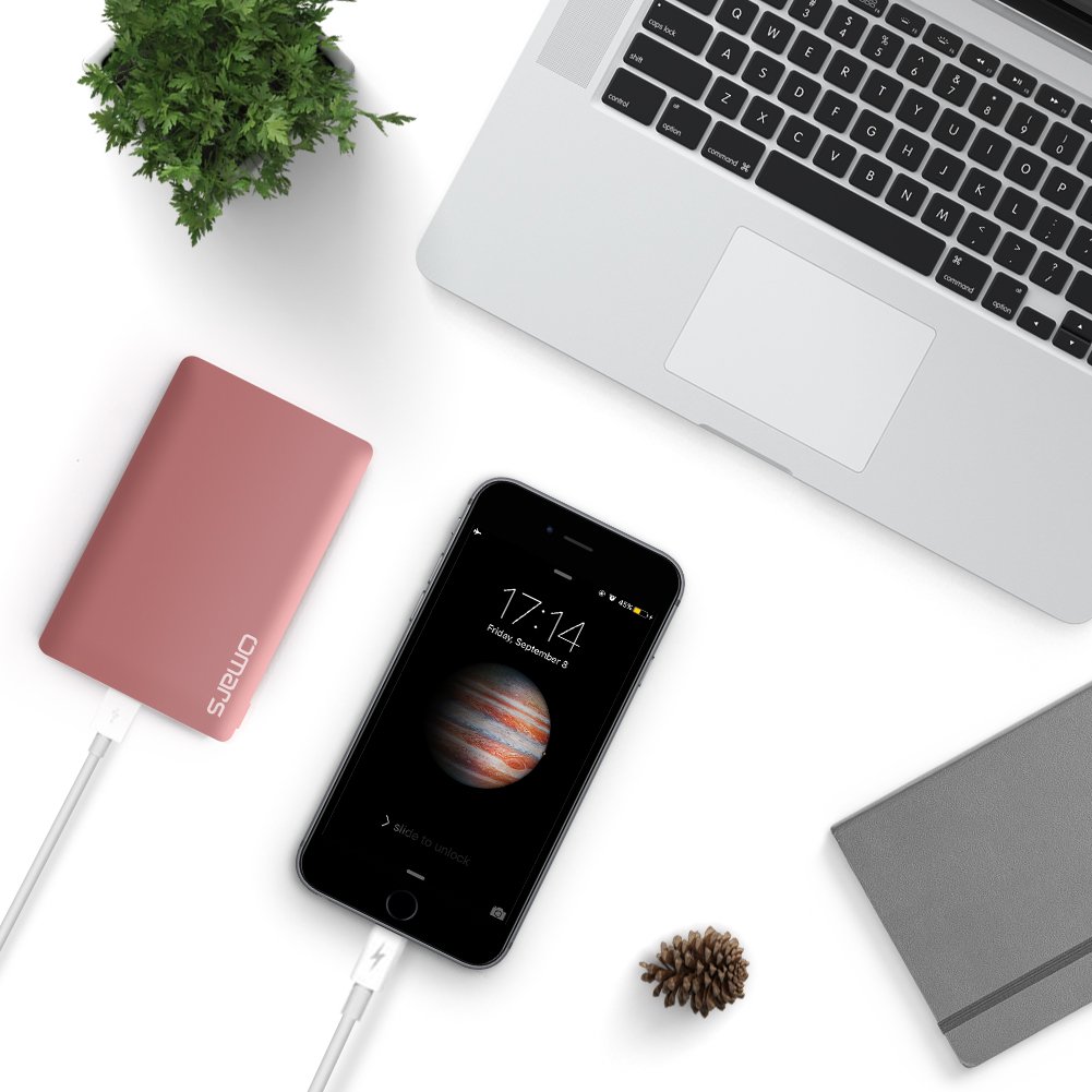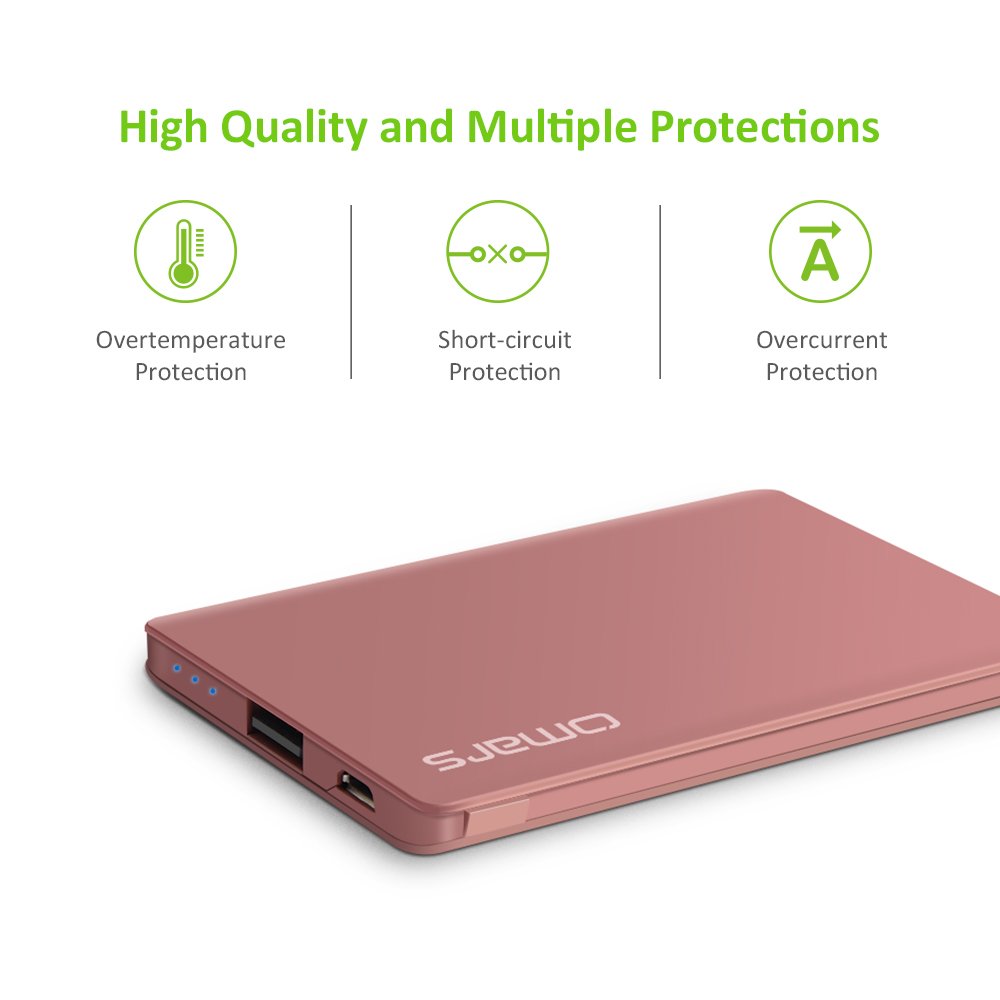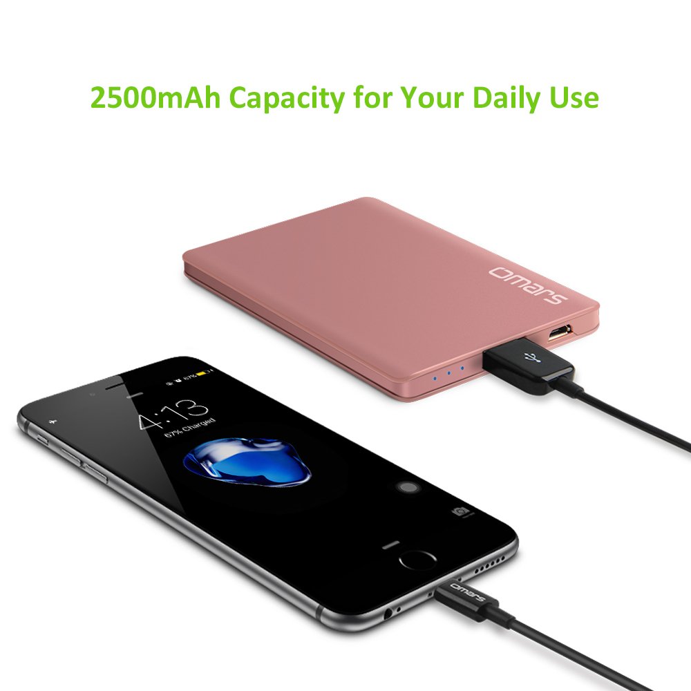 The Omars 2500 mAh power bank is ultra compact, thin and has pockets, 96 x 62 x 5.4 mm size, convenient for everyday carrying.
