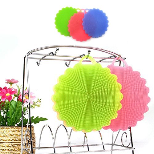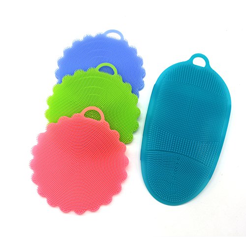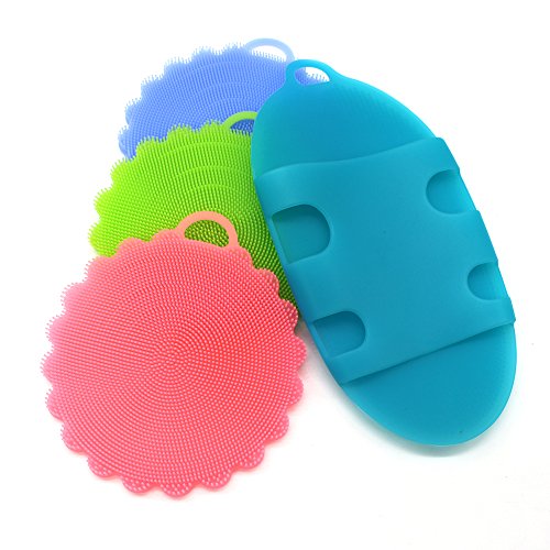3 PACK SILICONE DISHWASHING BRUSH SPONGE DISH TOWEL WITH SHOWER EXFOLIATION BODY SCRUBBER BATHING WASHING FOR KITCHEN WASH POT PAN DISH BOWL / WASH FRUIT AND VEGETABLE (4PCS MIX COLOR)