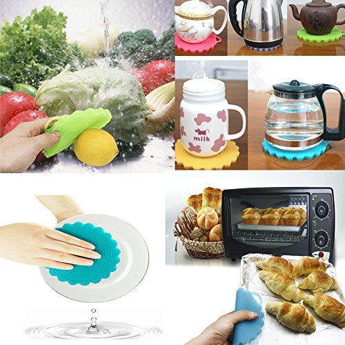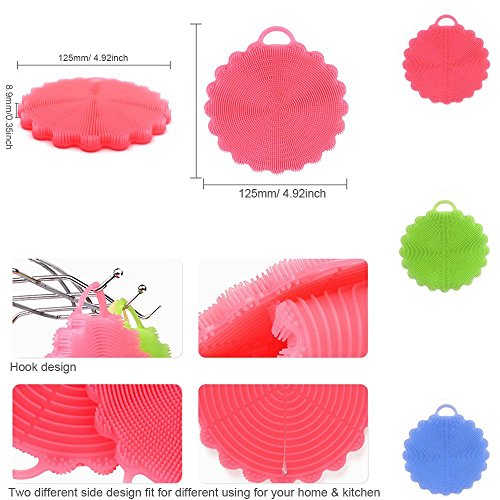 Multiple function for your home and kitchen: you can use this silicone brush for dishwashing, scrubbing pot or pan, washing fruit and vegetable, also it can use as a heat insulation mat, and the blue one have six holes on the back ,4 sizes small holes to place your thumb and little finger, there are two sizes larger holes on the ends which are designed for different sizes of hands ,best for face wash,body washing message,even for baby