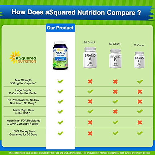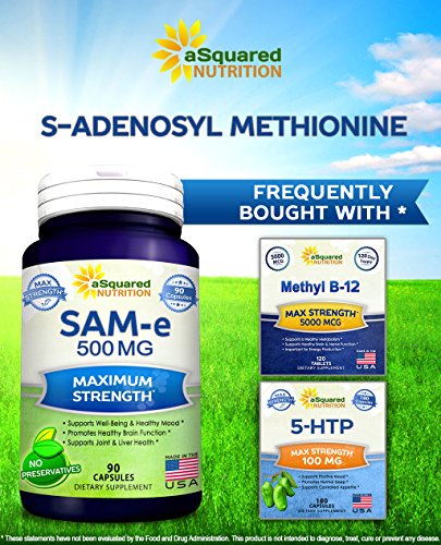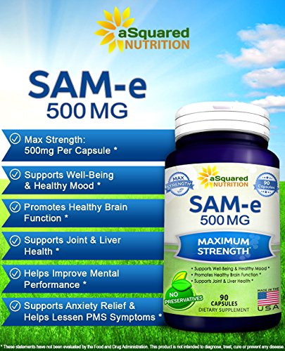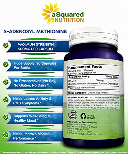 MAX STRENGTH SAM-e: aSquared Nutrition's maximum strength SAM-e supplement contains 500mg of SAM-e per capsule, and 90 capsules in each bottle. SAM-e (S-Adenosyl Methionine) is mostly consumed and produced in the liver, and acts as a regulator of processes including DNA methylation, amino acid metabolism, & immune reaction. Don't settle for other tablets or pills that only offer 200mg or 400mg of SAM-e per dose. We offer 500mg of SAM-e per capsule for a tremendous deal. *
