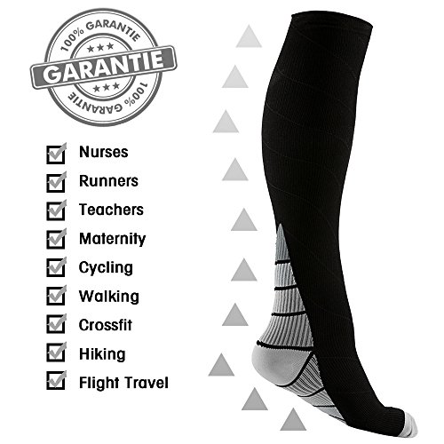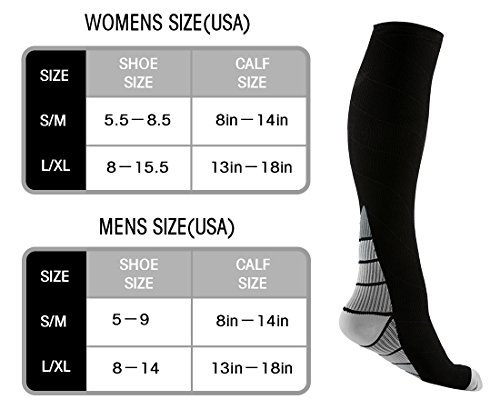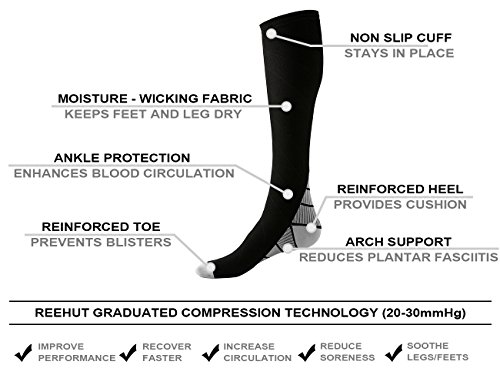 Features ? Graduated Compression, 20-30mmHg ? Superior grade circular knit structure ? Made of moisture wicking material ? Cushioned toe and heel support ? Stylish, 2 size range to choose ? Won't slip down legs ? Great for anyone on their feet all day ? Ideal for daily use and outdoor activities Benefits: ? Stimulate blood flow and improve blood circulation ? Better oxygen delivery to your muscles ? Reduce swelling and fatigue from prolonged sitting or standing ? Reduce feelings of heaviness and tiredness in the leg ? Reduce risk of deep vein thrombosis or blood clots ? Help speed up recovery time after surgery ? Help maintain healthy, energized legs People with the following symptoms may benefit from Reehut Compression Socks: ? Tired, aching, fatigued, and swollen feet ? Shin splints, and calf muscle pull ? Plantar fasciitis, and achilles tendonitis ? Edema, lymphedema, and venous insufficiencies ? Post-surgical recovery, and athletic recovery ? DVT, spider veins, and varicose veins Common occupations that may benefit from Reehut Compression Socks: ? Nurses and doctors ? Masseurs, cosmetologists, and stylists ? Frequent travelers or anyone taking a long plane flight ? Teachers, Warehouse, packing, or delivery occupations ? People with jobs that require prolonged standing or sitting Reehut Compression Socks - Energizes and Protect Your Legs! 0 |