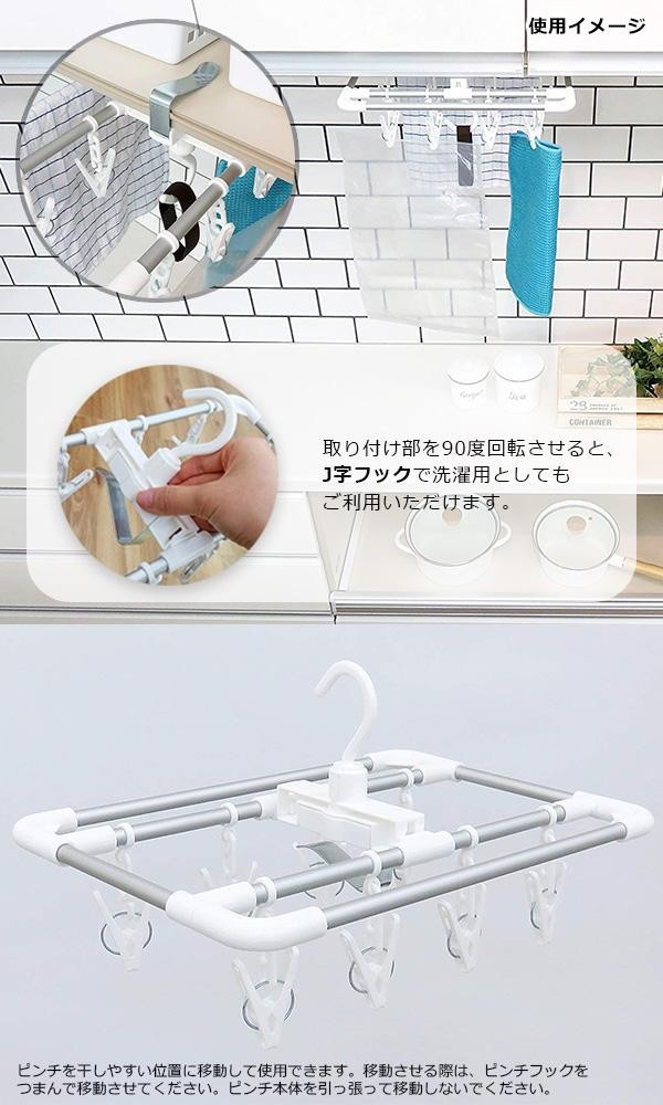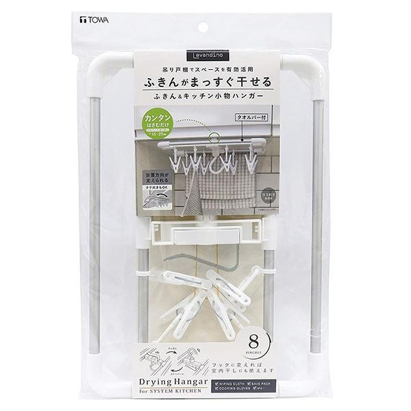 | 炊事手袋やふきんなどのキッチン小物を干すのに便利なピンチ8個付ハンガーです。吊り戸棚に差し込むだけで取り付けできます。アルミフレームを使用しているので軽くて丈夫!ピンチは、はさんだあとが残りにくい細かな凸面構造。傷んだら、お手持ちのピンチと取り替えることができます。 |