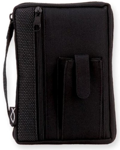 -. Feature : Specialty sized poly-canvas cover is perfect for your compact Bible or paperback book. Classic black with textured rubber side panel accent and ichthus tag. Features include a zippered exterior pocket, spine handle, and Velcro cell phone pouch. Fits Bibles up to 4" x 6.25" x 1".