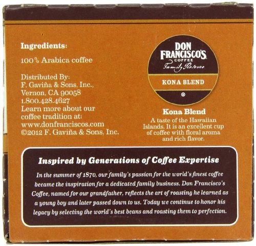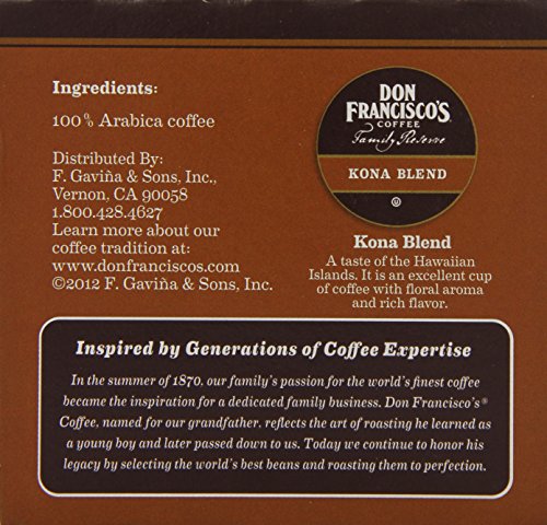The Gavina story began over a hundred years ago with brothers Jose Maria and Ramon Gavina. Seeking a better life, the two brothers left their homeland in the Basque region of Spain and traveled to the rich coffee-bearing soil of the southern Cuban mountains. It was on this productive land that their plantation, Hacienda Buenos Aires, began its reputation as the center of the region's coffee community. As a boy, Don Francisco worked in the fields with his own father, watching and learning the secrets of growing quality coffee. He spent hours upon hours helping the field hands sow the seeds and urging the little plants to grow. Don Francisco also learned how to pick and dry the beans and slowly, over time, how to judge which were the very best quality and which were not. From that day to this, only the highest quality beans are ever chosen for roasting under the Gavina label. Today these same traditions live on in the Gavina company. Don Francisco's four children - Jose, Leonor, Pedro, and "Paco" - who also grew up on the plantation, learned the art of growing coffee from their father. The company, now in America, reaps the benefits that come from this family's experience on their land. It is rare, indeed, for a coffee to come from a family company that pioneered one of the early coffee plantations. It is even more rare to find a coffee company managed by people born and raised in the artful profession. Beginning with their dedication to selecting the best coffee available, to offering it at a fair price, the Gavina family provides the best value in the business today. Compatible with Keurig K-Cup brewers. This product is not affiliated with Keurig, Incorporated.Feature