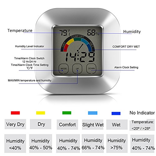 Digital Thermo-hygrometer with the Temperature Gauge, Humidity Meter and Built-in Clock Accurate temperature and humidity display Measuring the humidity and temperature of indoor air. The temperature range from 32°F - 122°F (0℃ -50℃)?and the humidity range from 20% - 95%. The temperature and RH readings are refreshed every 10 seconds to?showcase the current indoor air conditions in time. Household Necessity Ensure proper indoor humidity control has important skin, allergen and other health benefits. Smartech?Digital Hygrometers is perfect for baby room, bedroom, living room, storage room and office! The monitor?measures real time temperature and humidity accurately, allows you to know the real-time indoor environment?condition. Features: Touchscreen Large LCD display, multi-function Fahrenheit or Celsius available (MODE button) Record MAX./MIN. temperature and humidity data 12 hour / 24 hour displaying system selectable Comfort humidity level in rainbow color display Alarm and snooze function, 5 minutes snooze alarm Indoor outdoor temperature display Indoor humidity and time display LED Backlit Package Included: 1 x Humidity and Temperature Monitor 1 x English Manual 2 x AAA batteries 1 x Gift Box 0 |