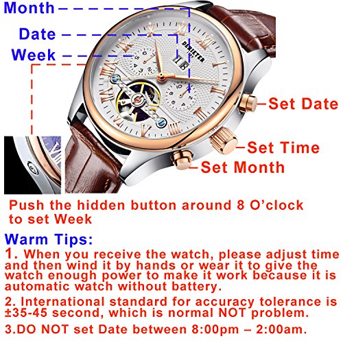5. 【NOTE】The Date runs from 00,01, 02, ..., to 39. So please adjust the Date on the first day of the month. It is just the movement design NOT quality problem.