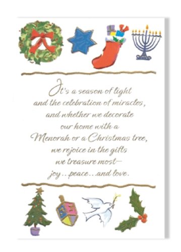 -. Feature : Interfaith Greeting Cards for those families that celebrate both Christmas and Hanukkah / Verse reads "Special thoughts and warmest wishes for a wonderful Holiday Season and a Happy New Year." / 18 Cards and envelopes / Embellished with gold foil with embossed treatments / Packaged in a deluxe box with acetate lid and gold stretch cord / Interfaith Greeting Cards