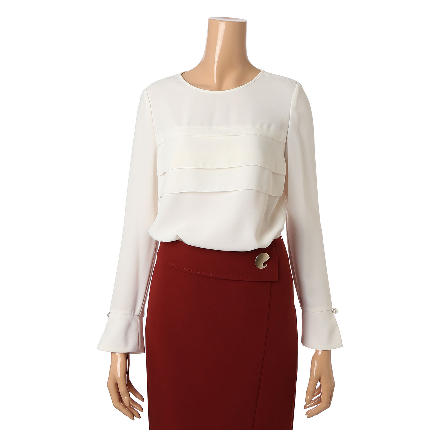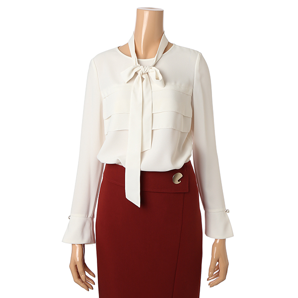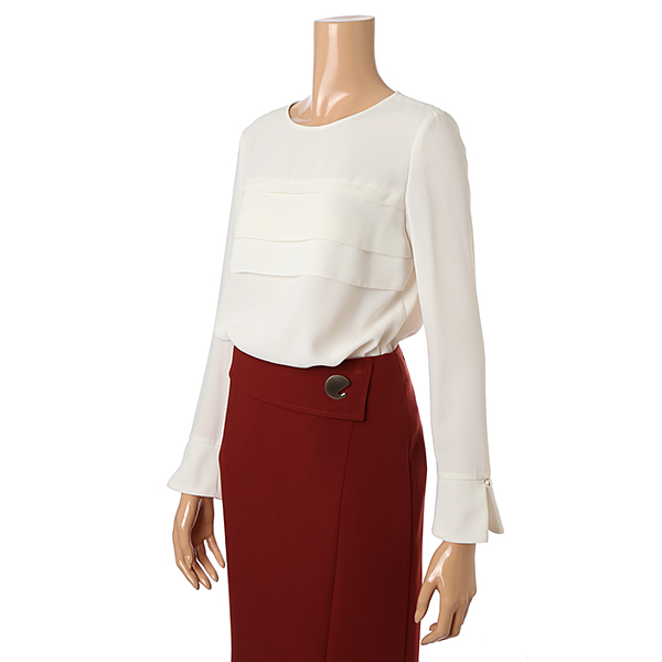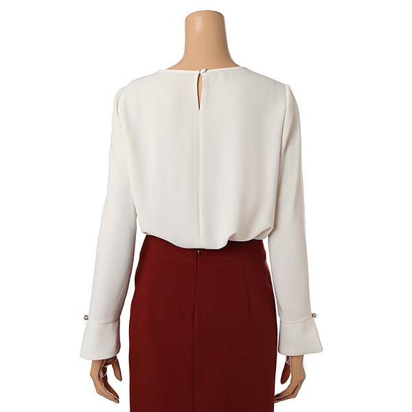 벨 실루엣의 소매에 펄버튼을 장식하여 우아함을 더하였습니다.