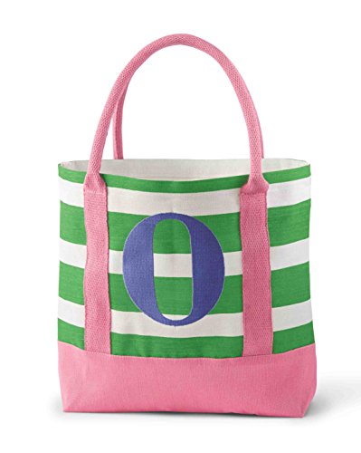 -. Feature : A fun tote with her initial on it; use for play or beach/pool time / Inside is laminate, making it easy to wipe clean / Tote measures approximately 14" x 12"