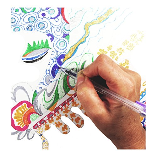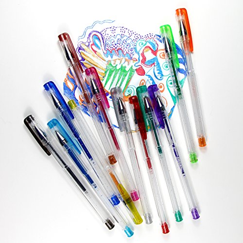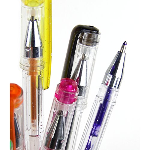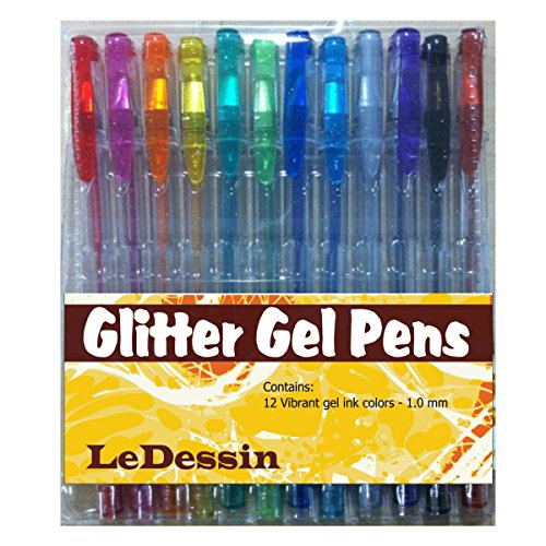 -. Feature : Set of 12 glitter gel pens | shiny | Colors include: Black, Silver, Blue Light, Blue Dark, Green Light, Green Dark, Yellow, Orange, Pink, Red, Purple / Great to sketch, draw, color, doodle, write, scrapbook, bible journaling, adult coloring books, details on watercolor and acrylic paintings / Ink comes out smoothly | Writes very well | Dries quickly | Once dry, doesn't fade or smear | Colors remain vibrant and bright | Smooth and rich in color / Glitter Gel Pens only | Great for Gifts, Children, artists / 30 days refund guarantee by Amazon
