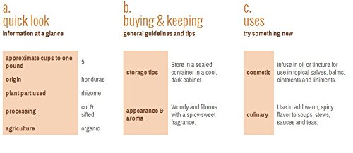 Studio : Monterey Bay Publisher : Monterey Bay Binding : Health and Beauty Product Description Ginger root has been used throughout Asia, South Africa and the Caribbean Islands for nearly 5,000 years. The dried, chopped root lends a warm, pungent flavor to soups, stews and tea blends. The dried root is also used to produce liquid extracts and tinctures. Ginger root has been used for healing and culinary purposes for more than 4,000 years. It is well documented in many ancient writings original to the herb's native domain of India. There is also recorded evidence that the herb was known to the ancient Greeks and Romans. In fact, ginger was one of the first spices to travel to the Mediterranean. Dried ginger root is typically used to produce teas, tinctures and tonics. It addition to proteins and lipids, the root provides vitamin B3, calcium, iron and other minerals. storage tips Store in a sealed container in a cool, dark cabinet. appearance aroma Woody and fibrous with a spicy-sweet fragrance. cosmetic Infuse in oil or tincture for use in topical salves, balms, ointments and liniments. culinary Use to add warm, spicy flavor to soups, stews, sauces and teas. 0