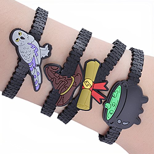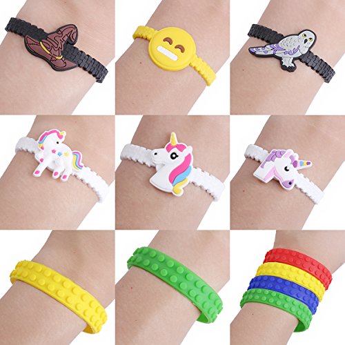 Fun 100pcs Assorted novelty Wristbands for Children. Themes include: Emoji Bracelets, Unicorn Bracelets, Brick Bracelets, and Wizard Bracelets.Feature