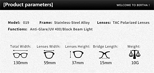 Product Description DISCOVER THE Bertha DIFFERENCE Provide The Best Quality Sunglasses and Customer Service on Amazon ? The super light Metal frame: You can hardly feel them on your face. ? Metal frame for the most comfortable fit available today in addition to unparalleled durability. ? Great fashion frame design for all active outdoor lifestyles. ? 100% UV protection lens. FEATURES AND BENEFITS ? Fashion and stylish design ? Good for door activities ? Lifetime Breakage Warranty on Frame Lens ? 30 Day Money Back Guarantee INCLUDES 1*Cleaning soft cloth 1*Cleaning soft fabric sunglasses pouch 1*Polarized Testing Card 1*Mini Screwdrivers CARE To avoid damage, never clean your sunglasses with paper towels or clothing, and also avoid using household detergents or soaps. While a few mild soaps don't harm lenses, today's extra strength soaps are powerful enough to slowly disintegrate lens coatings. [TIP!] Great gift idea