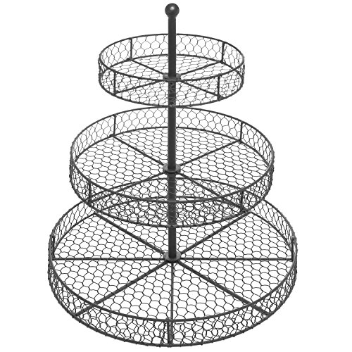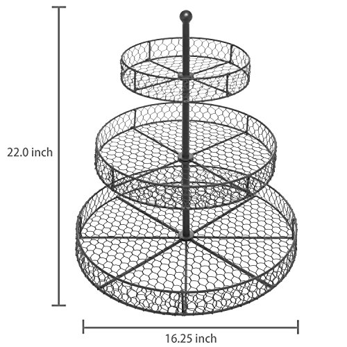Organize your kitchen and serve your party food in style with this lovely basket rack! Each one of the 3 round tiers is made of chain link metal with a classic brown finish for a lovely country-rustic look, and all 3 tiers are ideal for storing and displaying everything from staple foods like apples or onions to fancier fare like cupcakes and cookies. For a stylish kitchen storage solution that makes a lovely serving platter as well, this counter top storage rack is the perfect choice.*Due to monitor variations colors may appear slightly different.*