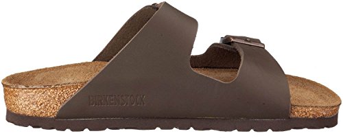 Enjoy easy styling with the Birkenstock Arizona Dark Brown Natural Oiled Leather Sandals, Unisex Women's or Men's Sandals (please refer to size selection). The on-trend Arizona Sandals from the German shoe brand Birkenstock has style and all of the comfort features you expect from a high-quality comfort sandal. Dark Brown leather upper with adjustable straps for a durable exterior and custom fit. The leather-lined, contoured footbed will mold to the shape of your foot creating a custom footbed that supports and cradles your each and every step. This Sandal features the Regular Cork Footbed which is the classic Birkenstock footbed (NOT the Soft Footbed). Raised toe bar is designed to encourage the natural gripping motion of your feet, exercising your legs and aiding circulation. Neutral heel profile and deep heel cup keeps the natural padding of your foot where it belongs, distributing your body weight more evenly. Flexible EVA outsole offers lightweight, shock absorbing support with lasting durability. Made in Germany by Birkenstock. * Difference between Normal/Regular (M) and Narrow (N): The letter "M" indicates "Medium/Regular/Normal Width Footbed", this is purposely wider than other sandals for added comfort. The letter "N" indicates "Narrow Width Footbed". * ** IMPORTANT: Arizona Sizing Information. Please note: Birkenstock makes the Arizona Sandals intentionally roomy for added comfort and customers reviews state that they tend to run 1/2 size (half-a-size) longer in length and that they are also wider than other sandals. Most people prefer it this way as the straps can always be tightened if needed!Feature