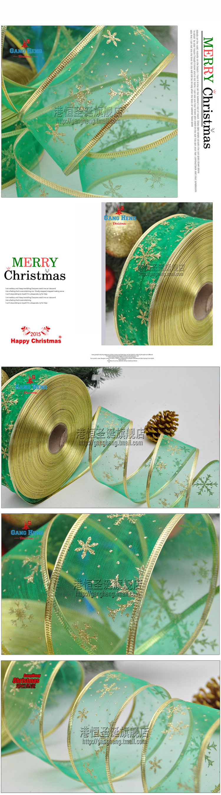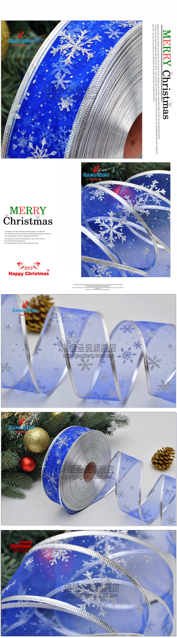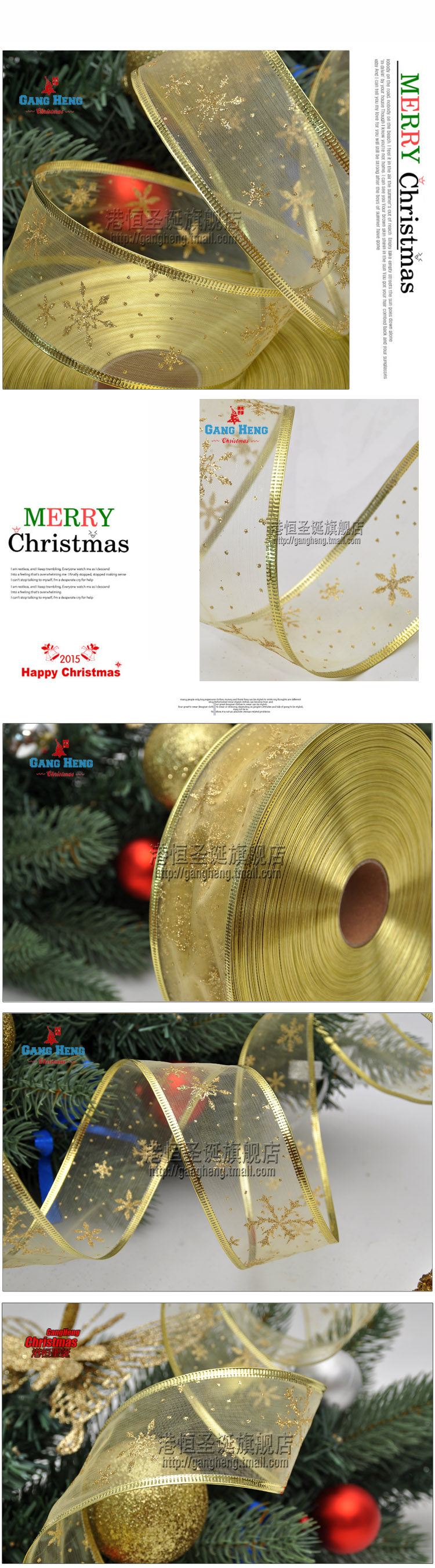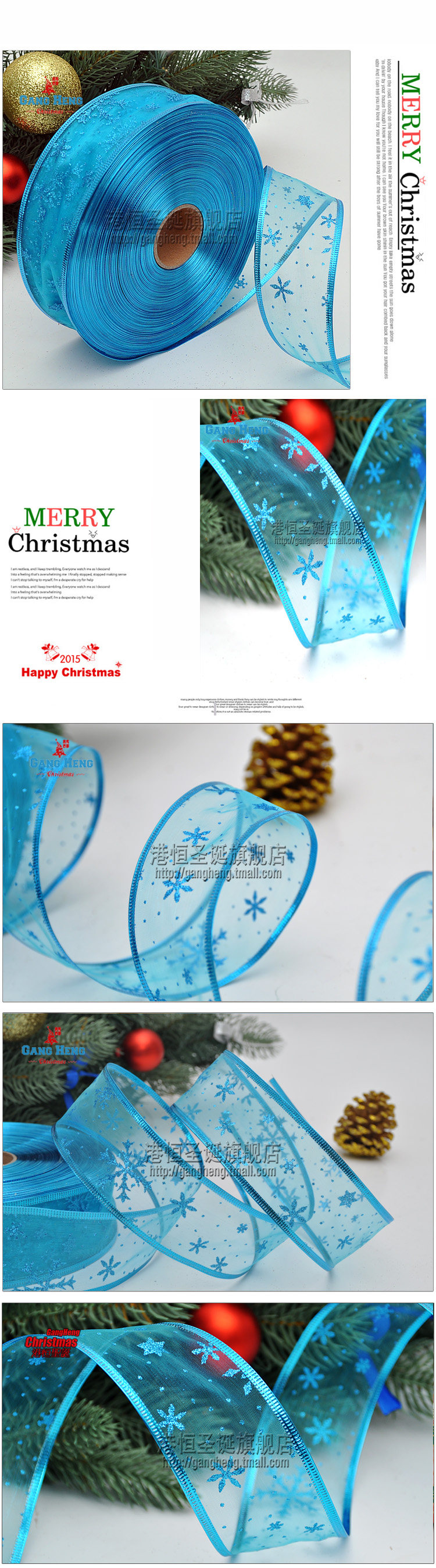 港恒圣诞树装饰200x6.3cm珍珠纱压边雪花图案圣诞彩织带/丝带 10g