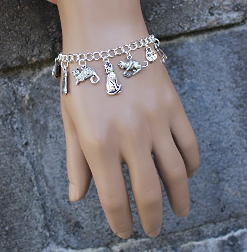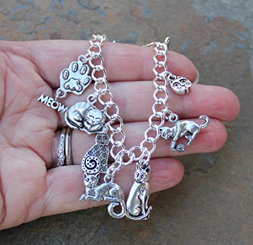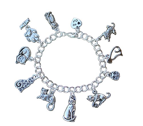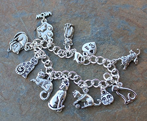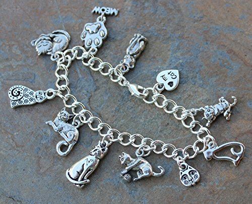 Here is a lovely charm bracelet for all the cat lovers out there -- it features 11 cat charms showing cats in various poses and forms, as well as a paw print charm with a "meow" dangle, and a heart shaped charm that has "♥ my cat" on one side and a paw print on the other.
