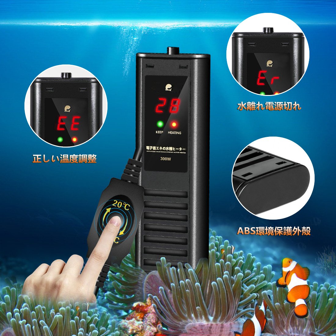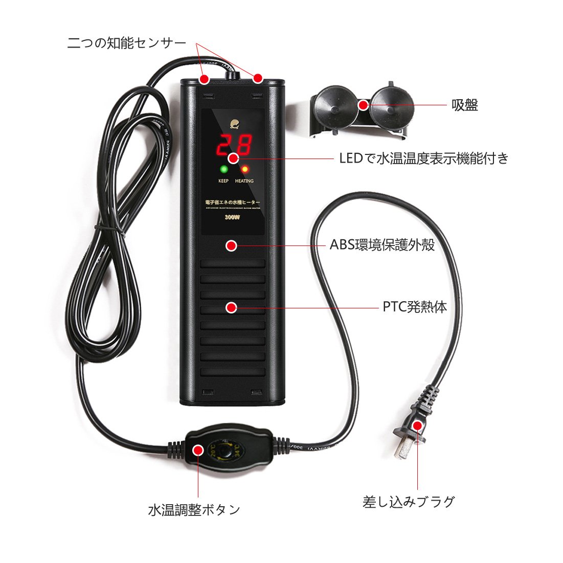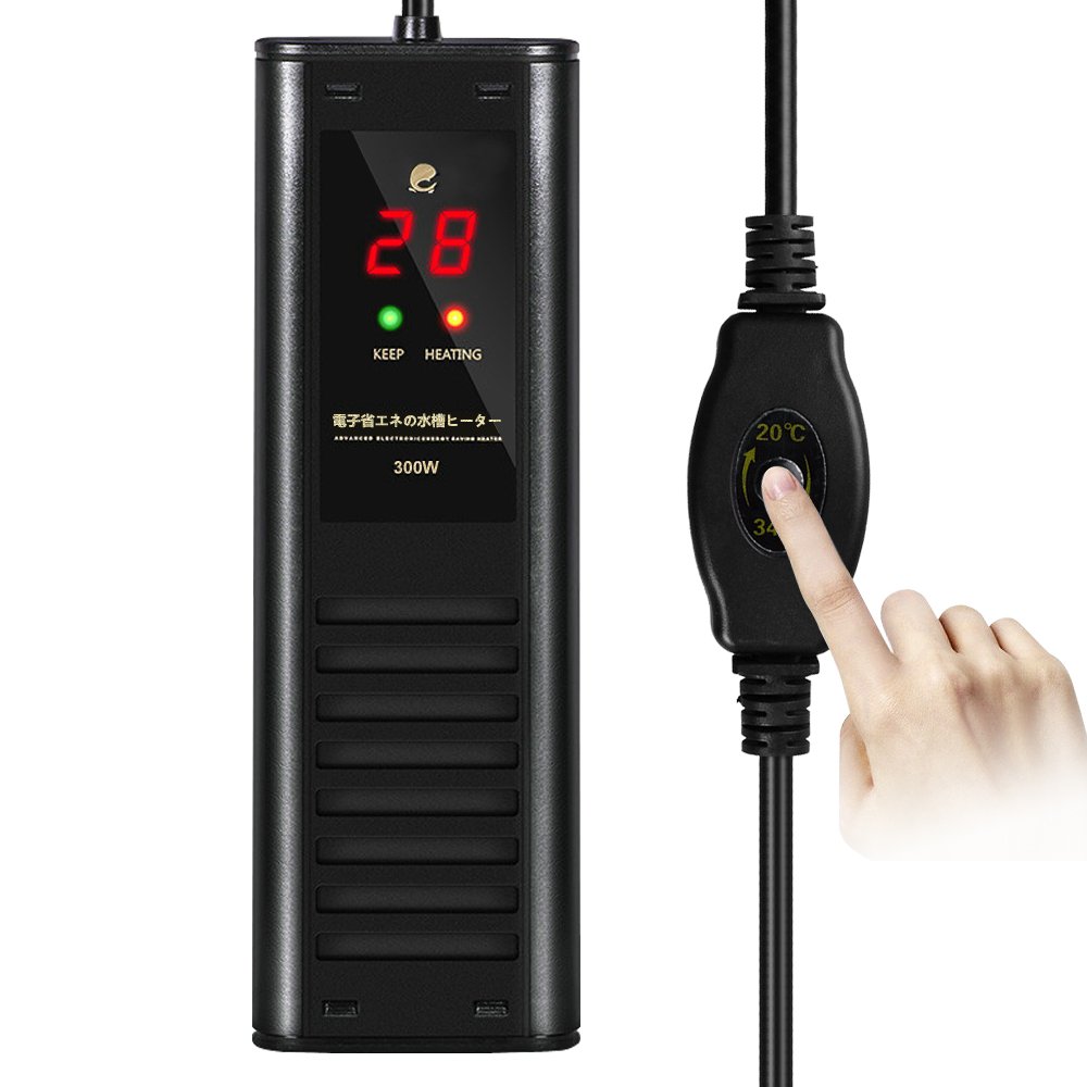 ● Integrated new structure auto heater of safety heater with compact thermostat to protect fish from heat! Integral type temperature heater of thermostat and 300W heater that can control water temperature to 20 - 34 degrees!
