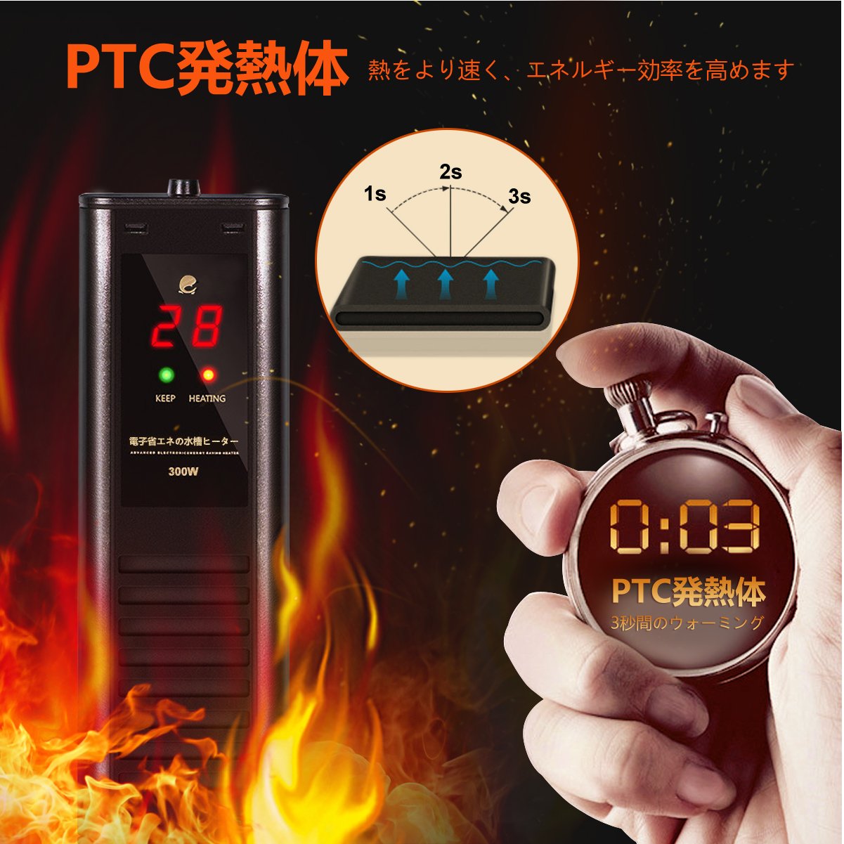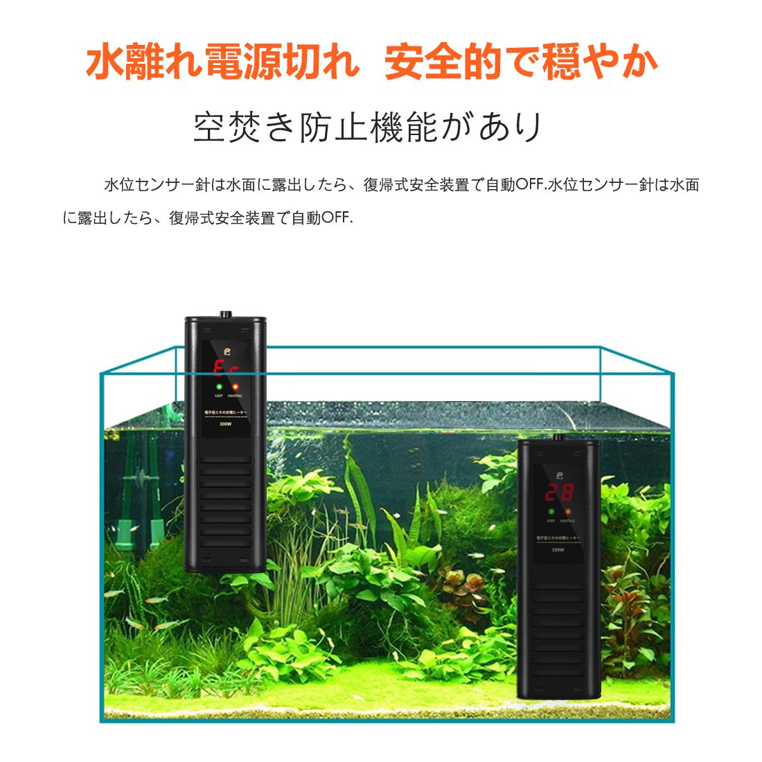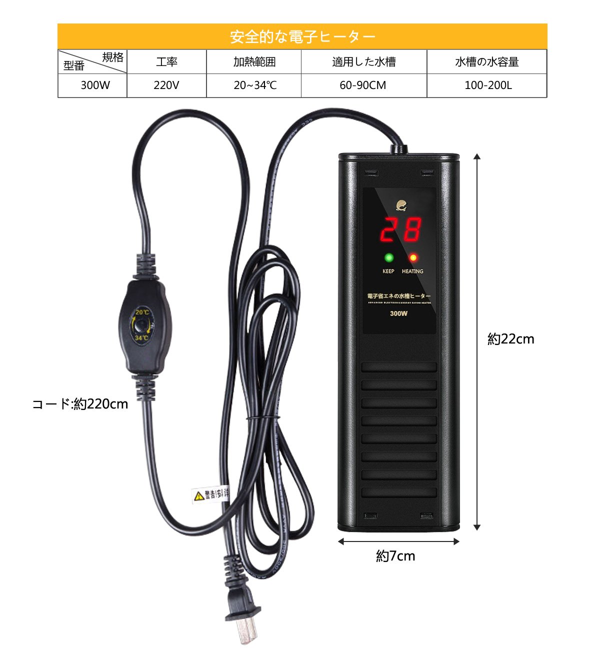 ● Integrated new structure auto heater of safety heater with compact thermostat to protect fish from heat! Integral type temperature heater of thermostat and 300W heater that can control water temperature to 20 - 34 degrees!
