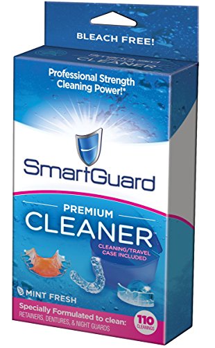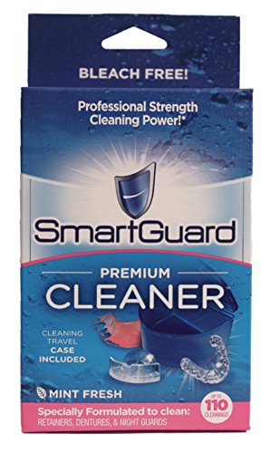-. Feature : 110 CLEANINGS: GUARANTEED not to discolor or darken your retainer, night guard, mouth guard, Invisalign, clear braces, snore appliance, denture, partial denture, TMJ splint. Other popular cleansers will darken expensive Invisalign or clear braces aligners, or cloud your soft night guard, but the SmartGuard Premium Cleaner will not, yet will kill bacteria and keep your appliance clean and like new. / MIX one packet in a 1/2 cup of water in the SmartGuard Travel Case or other small cup and place your appliance in. The cleaning solution will last 7-10 days. / YOU can clean your appliance in the solution for 20 minutes or leave it in all day if wanted. / AFTER you take out your appliance out of your mouth, rinse it under running tap water and place your appliance in the mixed SmartGuard solution and leave it in all day if that is convenient for you. The solution won't stain, discolor or burn your appliance like other popular cleaners can do. / Protect your expensive investment with SmartGuard Premium Cleaner. Clean with the best cleaner on the market. 100% Money back guarantee!
