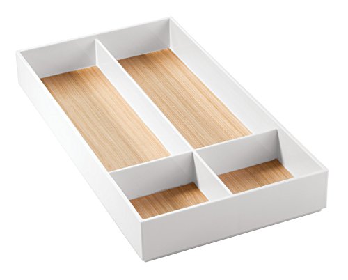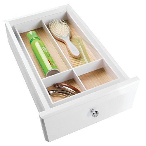mDesign Bathroom Drawer Organizer for Vanity to Hold Makeup, Beauty Products - 4 Compartments, White/Light Wood Finish