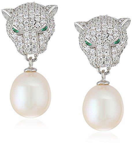 Rhodium-Plated Sterling Silver Freshwater Cultured Pearl and Cubic Zirconia Panther Dangle Earrings