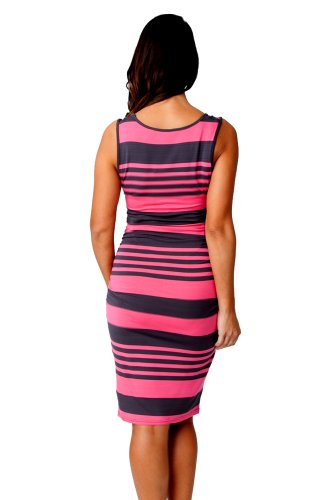 This boldly striped sleeveless dress will work for both maternity & nursing. This dress features a scooped neckline and side seam gathering. Discreet feeding access occurs by lifting the double layer at bust. 95% Viscose/5%Elastane Handwash or dry cleanFeature