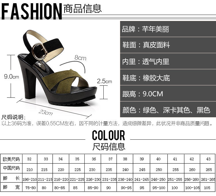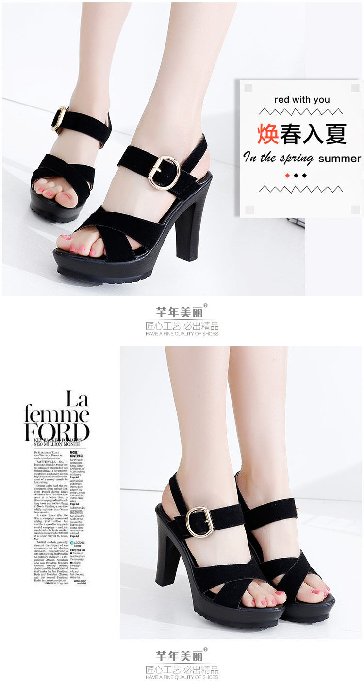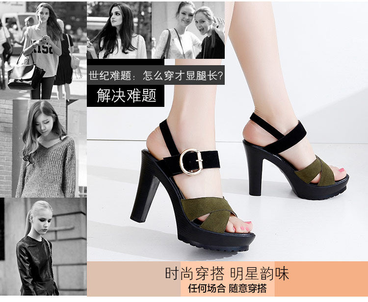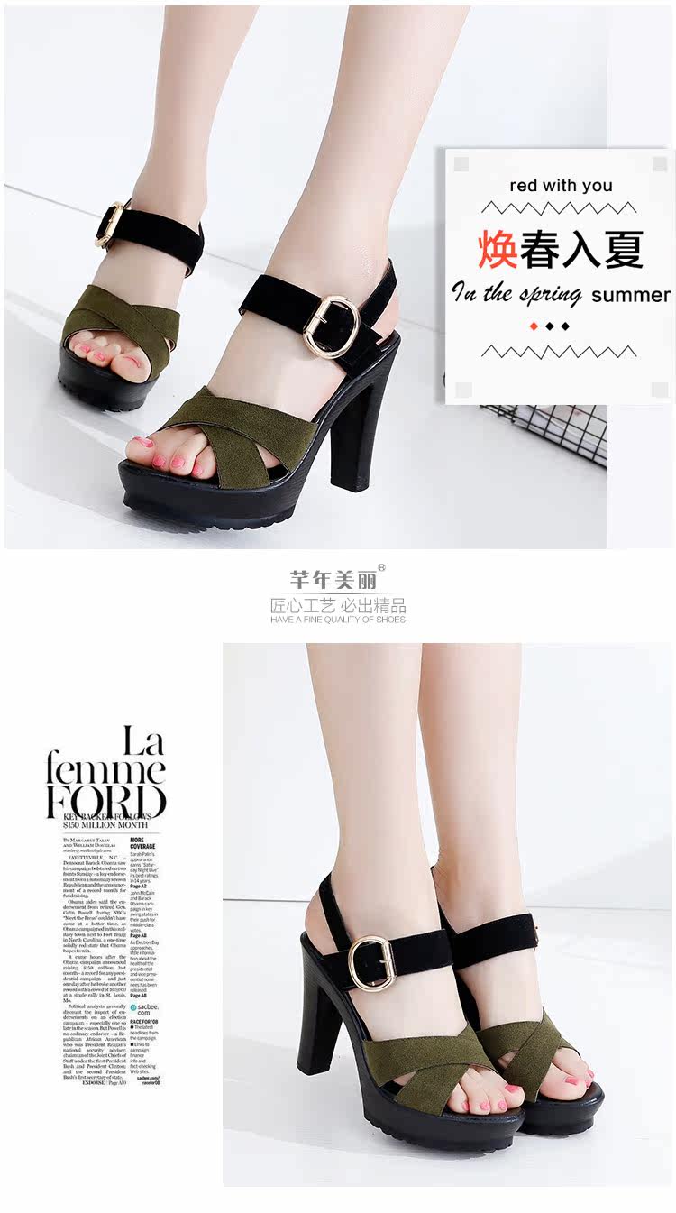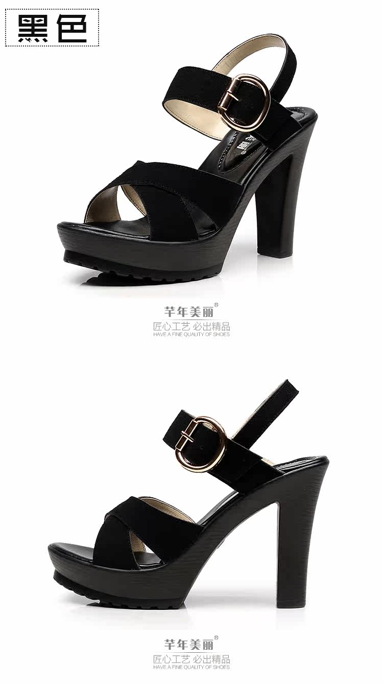 - 流行元素: 交叉绑带 镂空 搭扣 浅口 松糕跟 粗跟 防水台 金属装饰 皮带扣 罗马风格