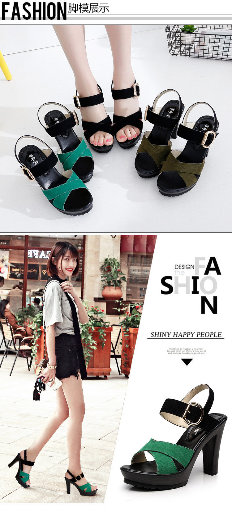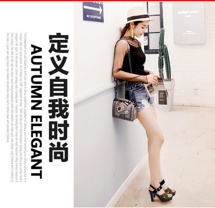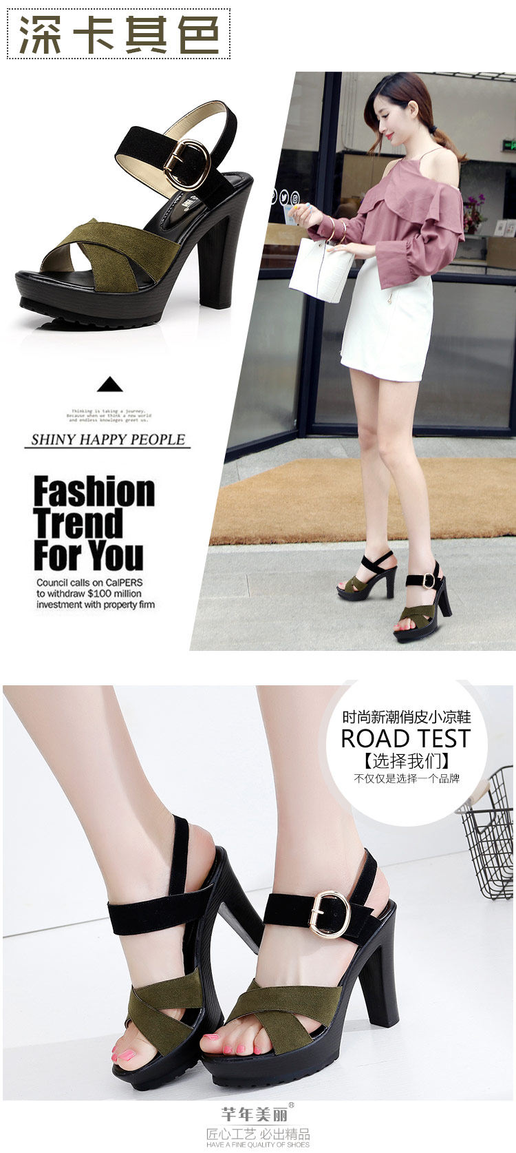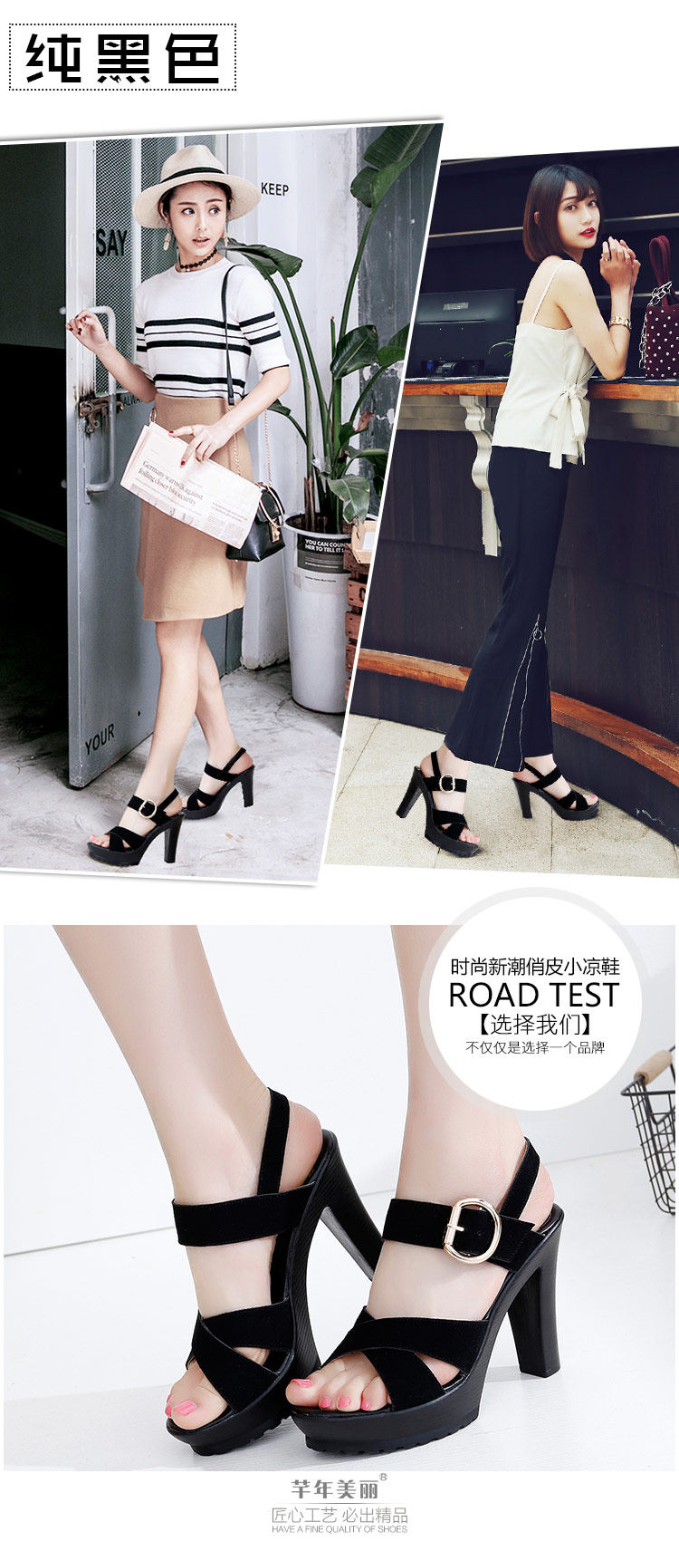 - 流行元素: 交叉绑带 镂空 搭扣 浅口 松糕跟 粗跟 防水台 金属装饰 皮带扣 罗马风格