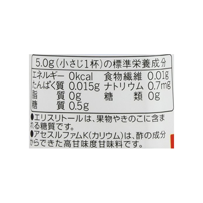 영양 성분 : 큰1주변 에너지/0kal,단백질/0.05g,지질/0g,탄수화물/0g,나트륨/2.5mg,당질/1.5g,음식물 섬유/0g