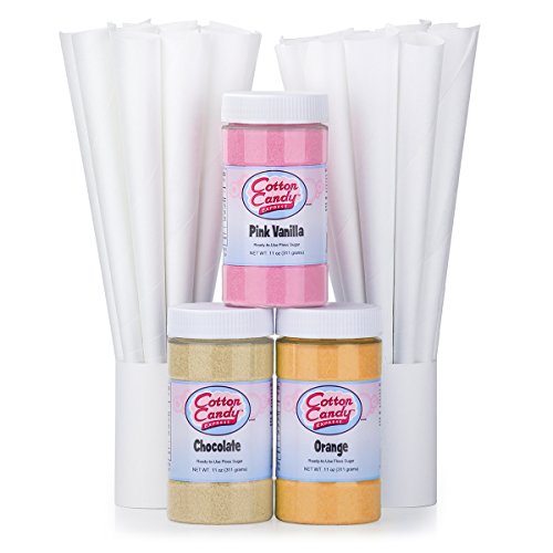 Cotton Candy Express Fun Pack | Kit Features Chocolate, Pink Vanilla & Orange Floss Sugars (11 oz Each) & 50 Paper Cones | Best Cotton Candy Maker Supplies | For Home or Commercial Use