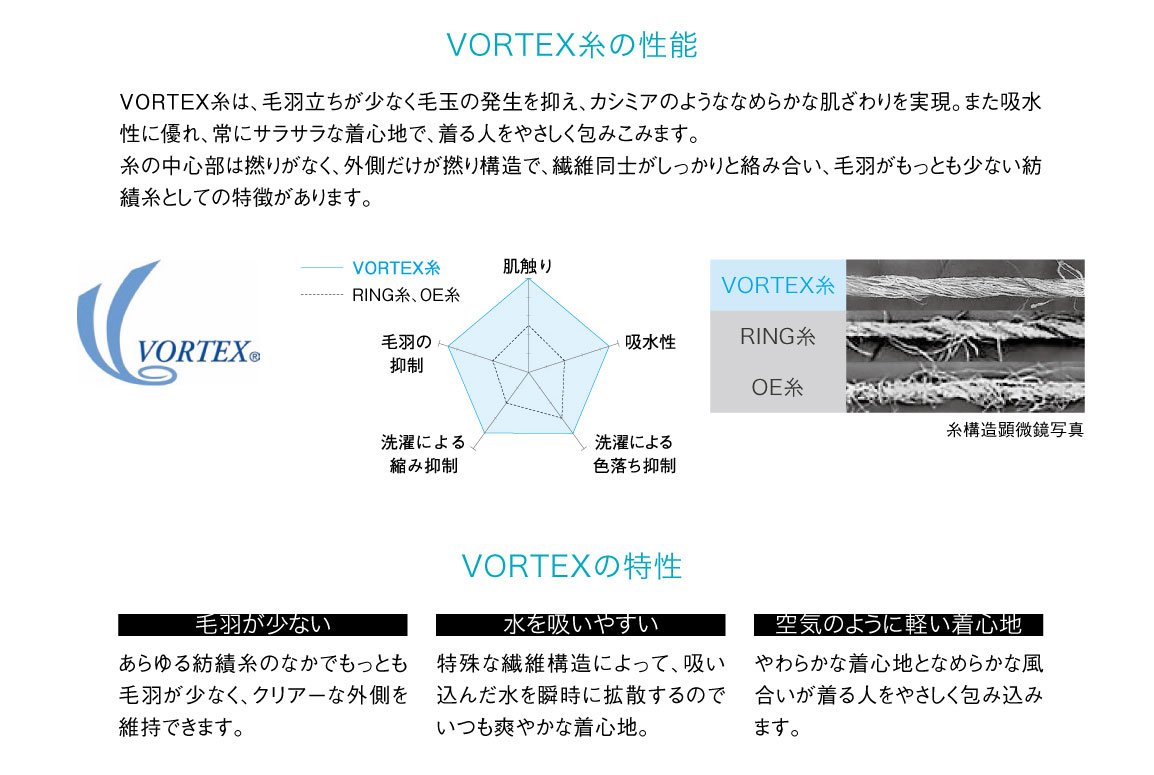 The characteristics of VORTEX are the most fluffy among all kinds of spun yarns and can maintain a clear outer side.