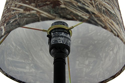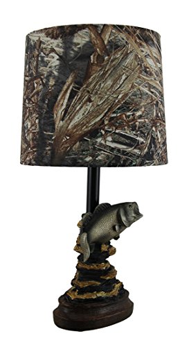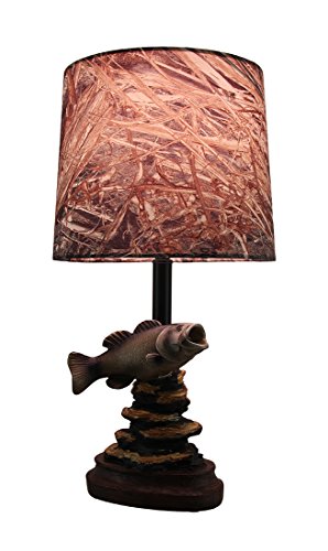 Mossy Oak lamps and shades like this Fish Accent Mossy Oak Lamp provide a unique set of lighting items that are great for developing an outdoorsy look. This dark woodtone, fish lamp goes great in summer homes and fishing cabins. This fish lamp has a hand-painted decorative base and features a Mossy Oak duck blind camo pattern fabric tapered drum shade. The dark woodtone, fish lamp has a push-through on/off switch, 60" black cord, and takes 1 max type-A 60W bulb or 1 max 15W SBCFL bulb. UL-listed, this Mossy Oak Fish Lamp requires assembly and measures 16" overall height.Feature