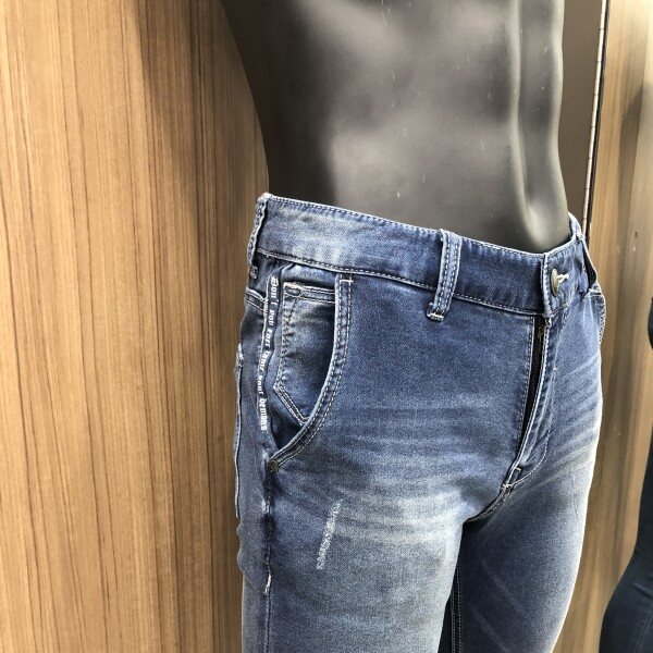 특수소재를 사용하여 극강의 편안함과 활동성을 강조한 아이템맑은 미디움 인디고 컬러와 포켓쪽 테이핑 디테일의 활동적이고 스포티한 느낌을 주는 디자인
