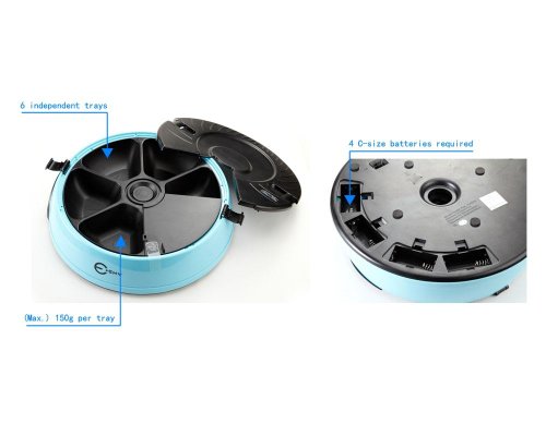 - Feature : With 6 separate food trays and programmable for up to 6 different feeding times. / Can record a 6-second voice message to be played automatically for each feeding. / Allows you to keep your pet on a regular feeding schedule while you are away. / Built-in clock, microphone, speaker, low battery indicator with easy-to-read LCD. 100% compatible with disposal food packs, wet and dry food. / Powered by 4 alkaline C-size batteries (NOT INCLUDED).