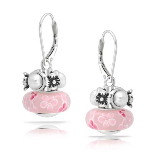 - Feature : Pandora Compatible Bead Earrings / 1.25 in L x .5 in W / .925 Sterling Silver / Murano Glass / Flower Motif