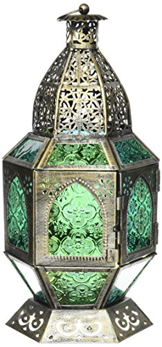 Ornate Six-Sided Candle Lantern with Green Pressed Glass Panels