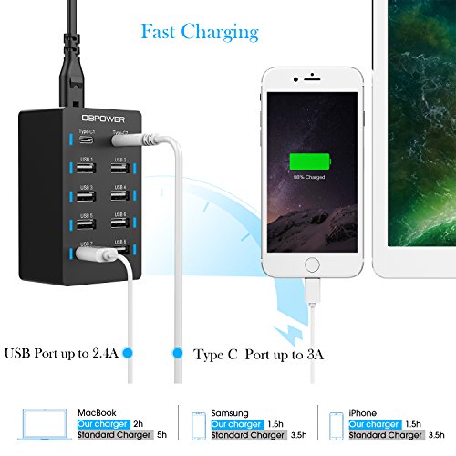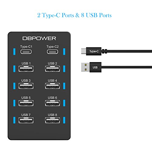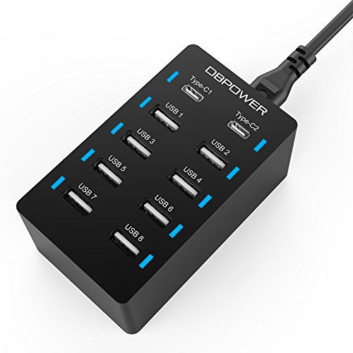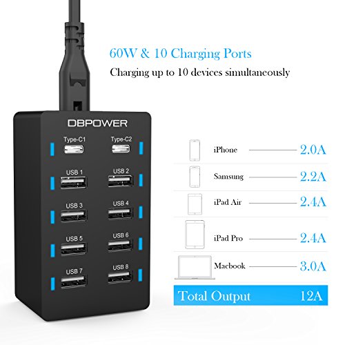 DBPOWER Dbpower Oplader, 60W 12A 10-Port Charging Adapter Quick USB Ladegerat mit 2-Port Typ C & 8-Port USB fur Macbook ,iPhone, iPad, iPod, Samsung, Tablets, Smartphones, Schwarz