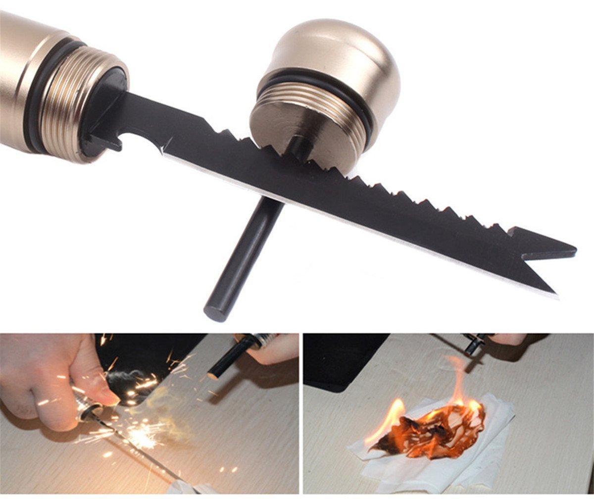 (Such as paper, dry grass, pine leaves, twigs and cotton etc) Please use the scraper and slowly rub the black layer on the surface of the flint.