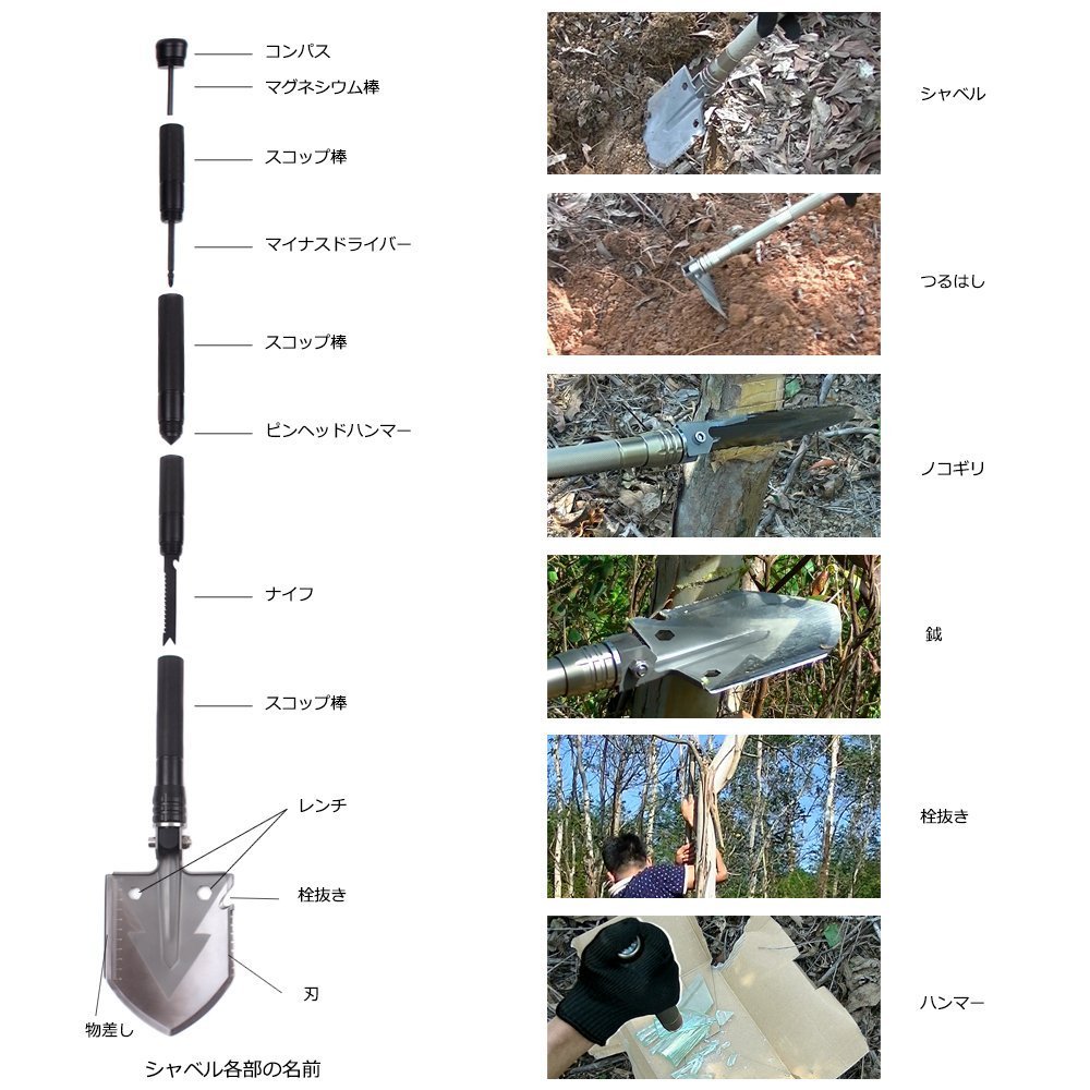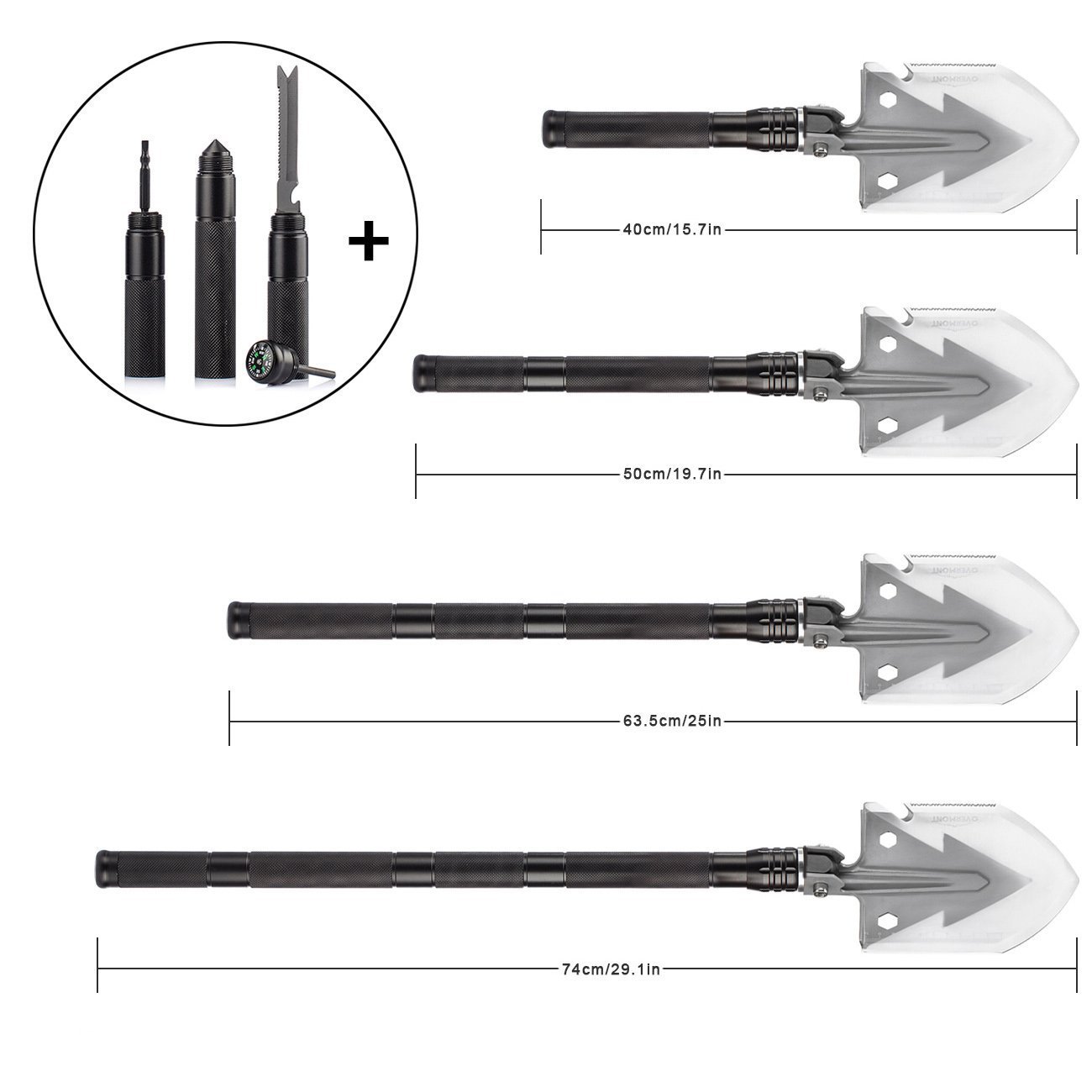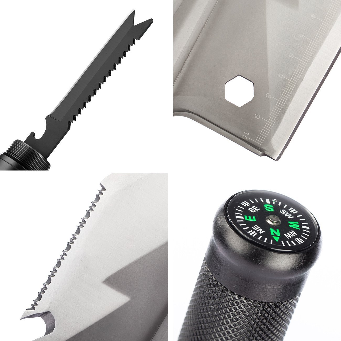 In some cases, you can switch between angles and choose between gardening and snow shovel, saw blade, ax, corkscrew, ice pick, fish knife, screwdriver, nail pulling, ruler, wrench and so on.