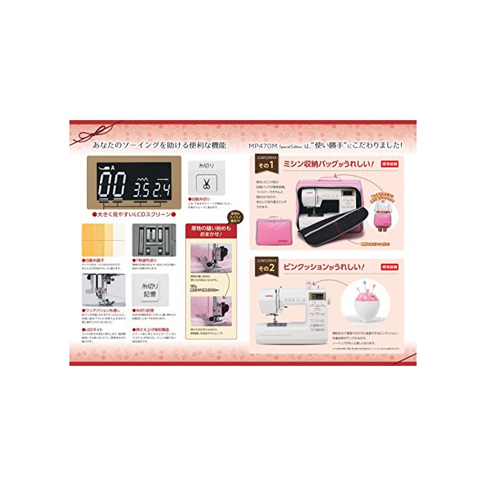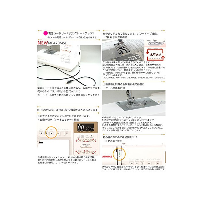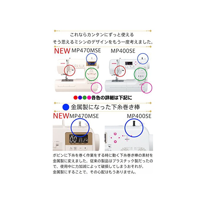 1,전원 코드가 미싱 본체에 수납 할 수 있는 코드 릴식으로.2,하실패축이 금속제에 변경 한 것을에 내구성이 큰폭으로 업.3,모양수가 30종류로 업.