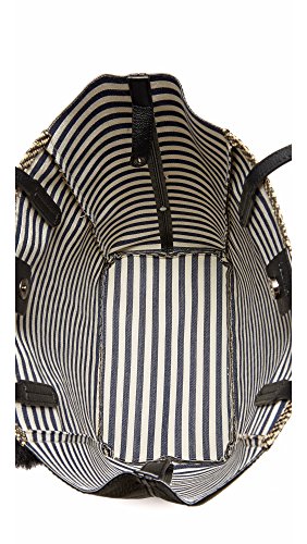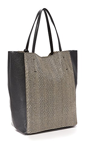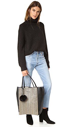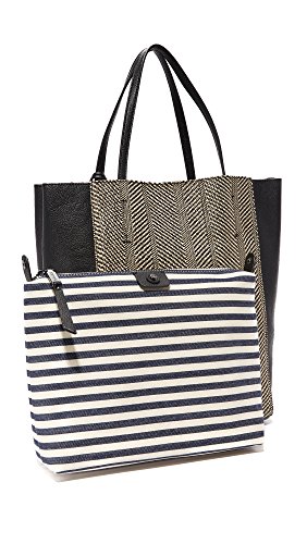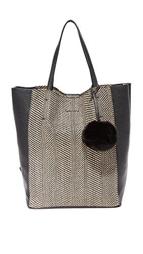 A large Splendid tote in soft faux leather and woven panels on each side. Open top and fused canvas lining. A striped detachable zip pouch stows inside. Small tethered faux-fur charm at the slim top handles.Feature
