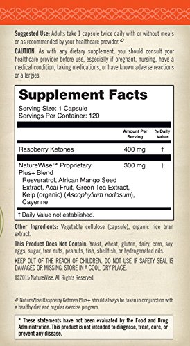 Only nature's best ingredients. Every capsule contains 400 mg of raspberry ketones with green tea extract, African mango seed extract, resveratrol, cayenne, acai, and organic kelp.