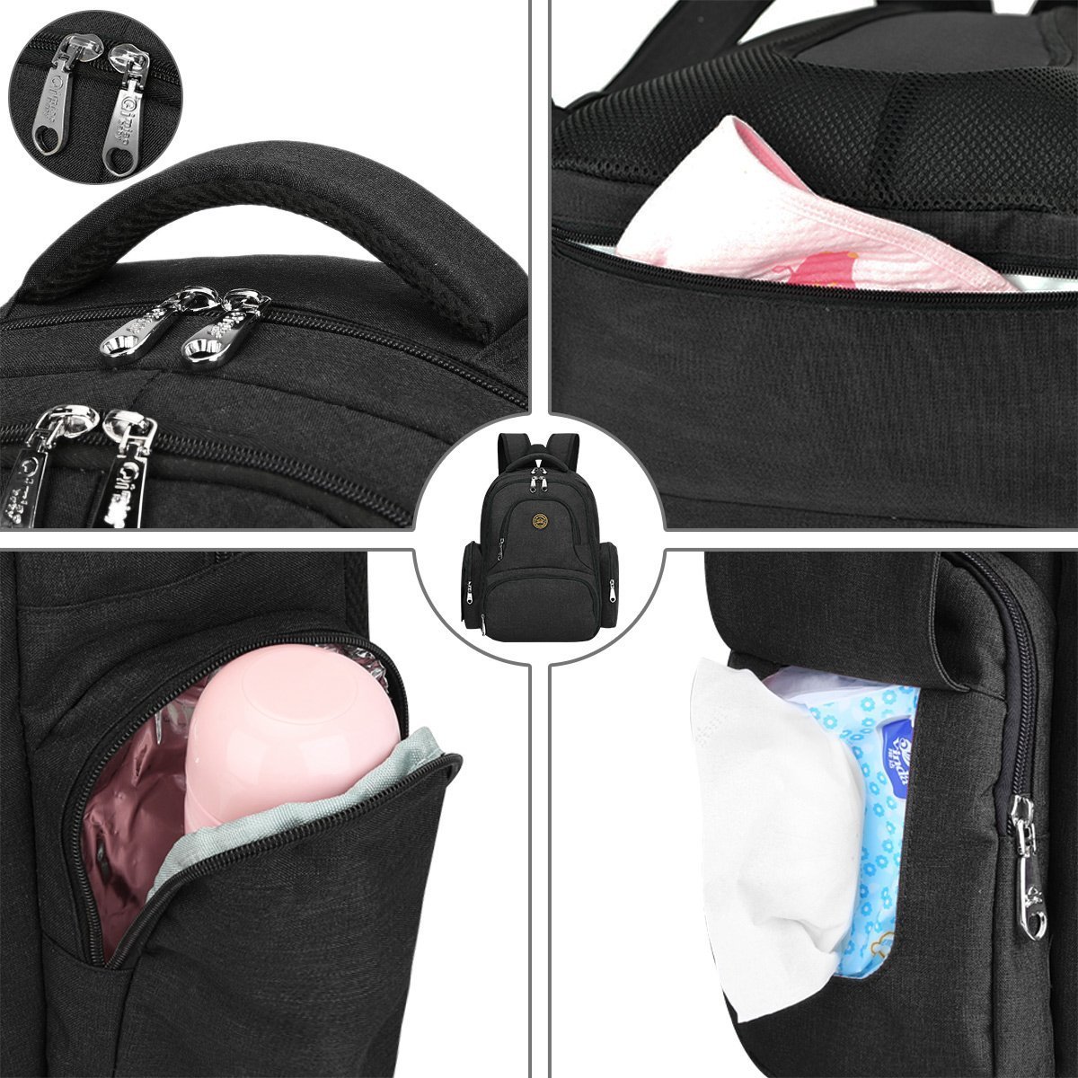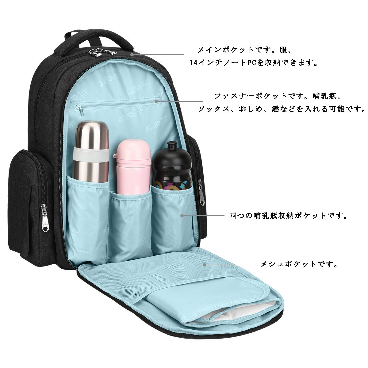 This pocket has a baby bottle storage pocket, mesh pocket, zip pocket.