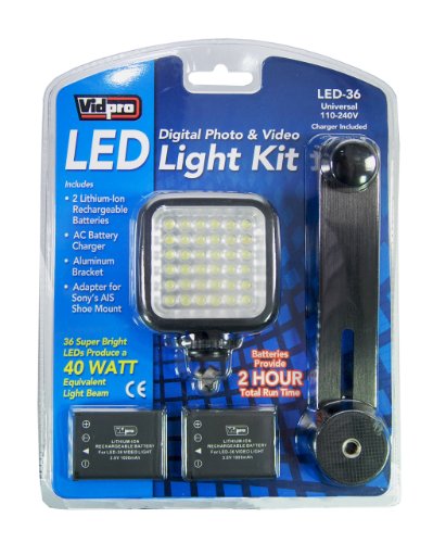 Deluxe LED Digital Video Light Kit with Support Bracket, with Li-Ion Batteries and Charger. + 36 powerful LEDs provide bright, 40W equiv. even lighting to a range of 25 feet
