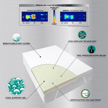 -. Brand : Homedics -. Color : White -. EAN : 0818023016447 -. Feature : Cool support, gel-infused memory foam Advanced CoolFlow technology / Ceramic gel beads help keep foam cool throughout the night Easy-on, easy-off breathable knit cover with elastic for custom fit and is machine-washable / Gentle pressure-point relief Unique balanced support / All foam used in this product carries the CertiPUR-US seal Allow 24 to 48 hours for foam to expand / Dimensions of toppers are made slightly smaller than mattresses to ensure proper fit -. Label : HoMedics -. Manufacturer : HoMedics -. MPN : B01GK2P538 -. PackageQuantity : 1 -. PartNumber : B01GK2P538 -. ProductGroup : Home -. ProductTypeName : HOME_BED_AND_BATH -. Publisher : HoMedics -. Size : Twin: 73" x 37" x 1.5" -. Studio : HoMedics -. Title : HoMedics 3" Cool Breeze Memory Support Mattress Topper TWIN -. UPC : 818023016447