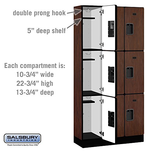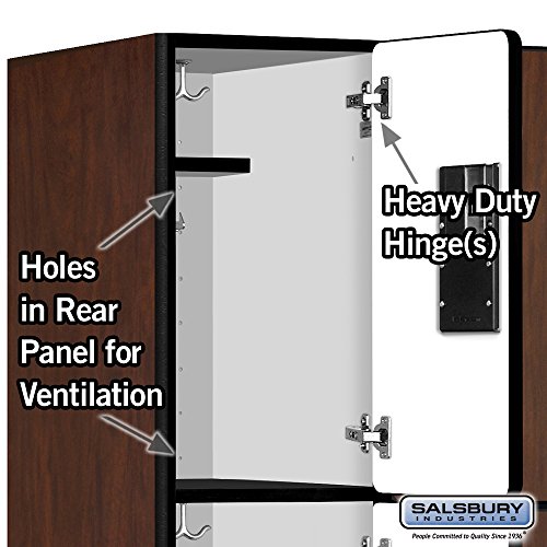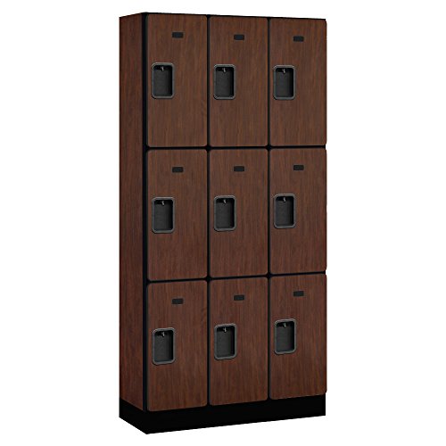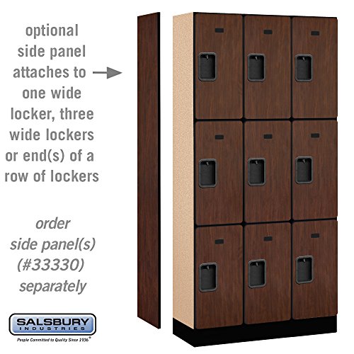 Salsbury 30000 Series Designer Wood Lockers are ideal for settings where a professional environment is desired. Designer lockers are 12 inch wide, are available in Single Tier, Double Tier, Triple Tier, Box and Double Tier 'S' Style configurations and in 6 high pressure laminate finishes (Gray, blue, black, maple, cherry or mahogany). Designer lockers are available in heights of five (5) feet and six (6) feet and include a 4 inch black base (add 4 inch for the base) and in depths of 15 inch, 18 inch or 21 inch. Optional matching laminated sloping hoods and side panels easily attach to designer lockers and provide a finished look to an individual locker or a row of lockers. All locker doors are 12 inch x 3/4 inch deep and include a black name / number plate. All locker doors also include heavy duty concealed hinges and a lift up handle an recessed hasp for added security. Built-in locks (#33310 for combination and #33315 for key), padlocks (#33320 for combination and #33325 for key), electronic locks (#33390) and resettable combination locks (#33395) are available upon request. One wide lockers are available as fully assembled units only. Three (3) wide lockers are also available as fully assembled units only and required minor assembly.Feature