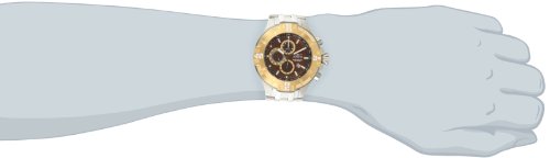 Chronograph functions with 60 second, 12 hour and 1/10th of a second brown subdials with gold tone borders; date window at 4:00